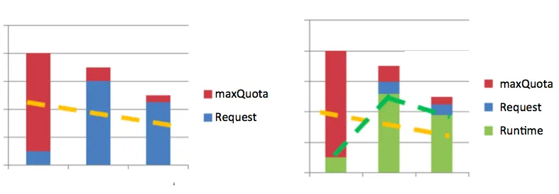 假设系统中存在3个QuotaGroup组,为了简单,假设3个组的minQuota都为0; 左图中,蓝色部分是每个组的Request,红色部分是maxQuota,黄色虚线表示每个组按照ratio比列划分得出的可用quota水位线: