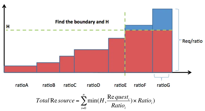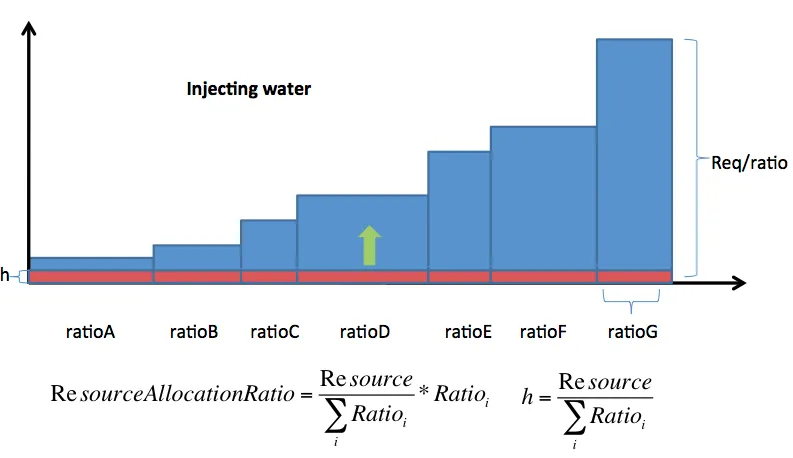 2、将集群总资源按照ratio比例均匀的撒到每个组(往桶里面倒水), 故所有桶的水面高度(h)一齐上升。
