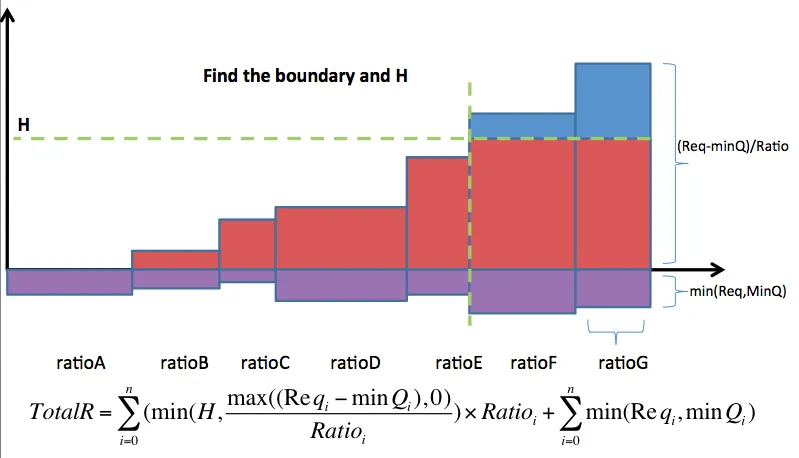 由于每个桶是按照Request/Ratio排序的,所以可以通过构建一颗自定义的旋转的红黑树,就可以以O(logN)的时间复杂度来找出边界点,找出边界点后,通过公式:
