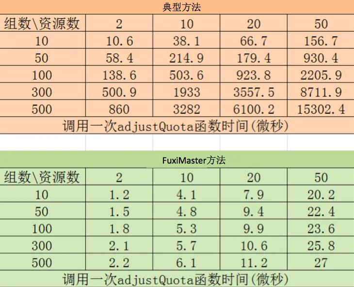 可以看到,FuxiMaster目前采用的方法与组数是对数关系,与资源数成线性关系,符合预期;相对于典型方法,性能提升巨大
