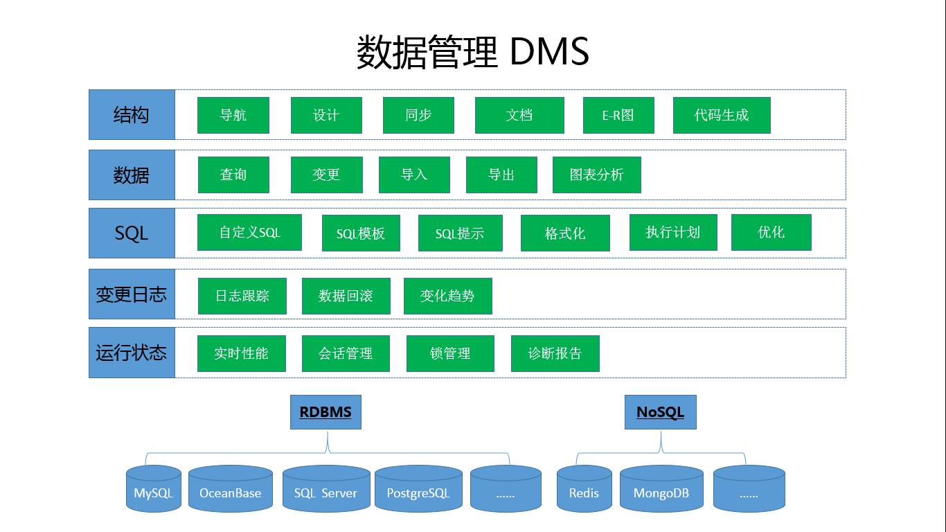 DMS支持MySQL、SQL Server、PostgreSQL、MongoDB、Redis等关系型数据库和NoSQL的数据库管理。你可以用DMS对数据、结构、SQL、变更日志、运行状态、审计数据等进行管理。