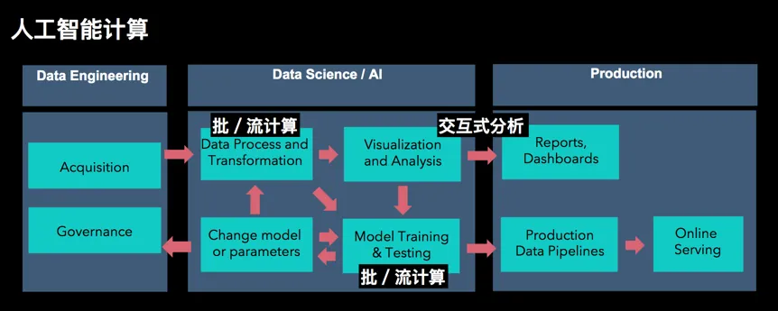 人工智能计算的种类很多,但是整体架构大多和上图所描述的类似。一个常见的ML pipeline通常涉及一系列的数据预处理、特征提取和转换、模型训练以及验证。如果验证后的效果符合预期,就可以将模型推到线上服务。如果不符合预期,算法工程师就需要调整算法模型或者参数,然后再做一次模型的训练和验证,直到对结果满意后,再将训练好的模型推上线服务。整个计算过程可以是对一个确定大小的数据按照批计算模式计算,也可以接入实时数据按照流计算模式进行计算。上面这个pipeline是人工智能计算最基础的流程,如果算法工程师对数据以及业务特点非常熟悉,他们就能设计出合理的算法模型和参数。但是往往更常见的情况是,算法工程师需要分析工具帮助他们理解数据。只有在很好地理解了数据特点之后,才能提取出更有用的特征,设计出更好的模型。因此,如下图所示,做好人工智能计算,不可或缺的一部分就是交互式分析。有了交互式分析,算法工程师可以对数据做各种ad-hoc query,从而帮助他们更好地理解数据。