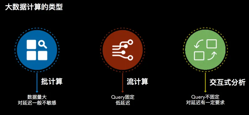 在全面介绍Flink的新进展之前,我先来介绍一些大数据和人工智能计算的背景。大数据计算的种类非常多,比较典型的,且被大规模使用的主要是3种类型: