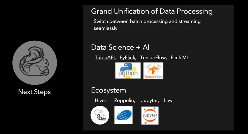 在易用性和生态方面,我们一方面帮助Flink社区在tableAPI,Python,以及ML等诸多领域发力,持续提升用户做Data science和AI计算的体验。另一方面,我们也在努力完善Flink和其他开源软件的融合,包括Hive,以及Notebook(Zeppelin, Jupyter)等等。这些诸多的努力,都是为了最终实现我们“一套引擎完美解决大数据智能计算”的初衷。Apache Flink自2014年开源至今也才4年,我们期待更多的企业和开发者们和我们一起参与到Apache Flink的社区和生态建设中来,共同把它打造成为全球最一流的开源大数据引擎。