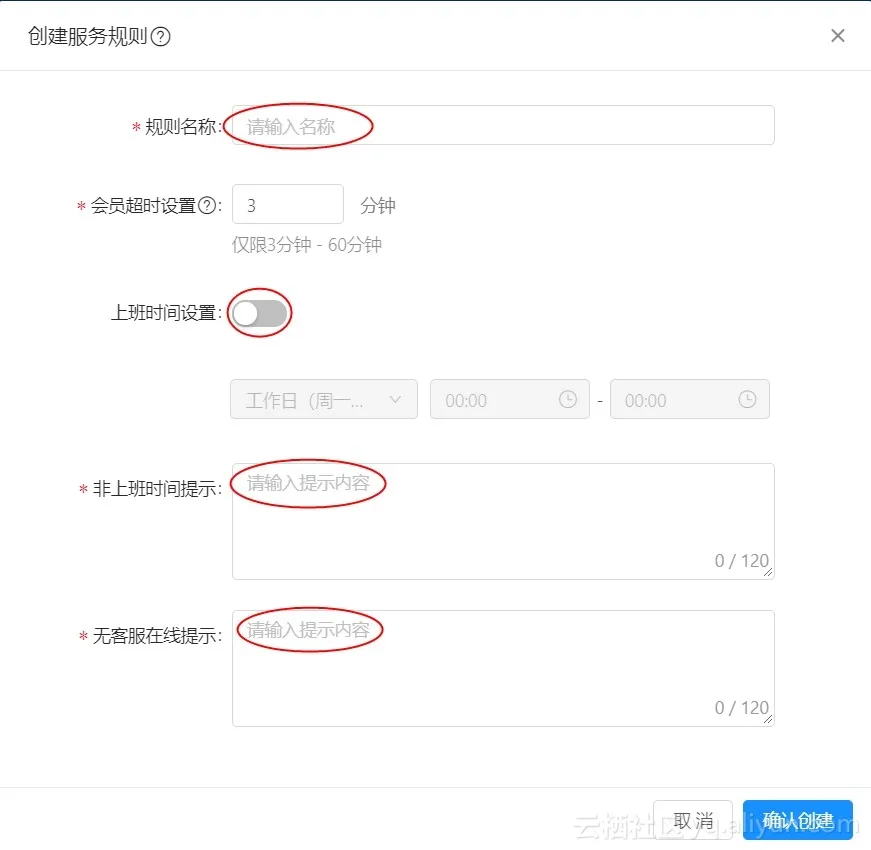输入规则名称(如“客服、售后、售前等”)、会员超时设置、上班时间设置、非上班时间提示(如“现在客服还未上班哦,你可拨打XXX联系技术工程师”)、无客服在线提示(如“现在暂时没有客服在线呢,请您过一会再来吧!”)输入完毕后点击确认创建,即创建完毕。