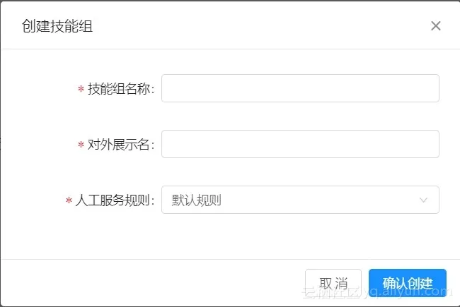 填写技能组名称、对外展示名、人工服务规则(此时因未维护其他规则,只能选择默认规则),填写完毕后点击确认创建。