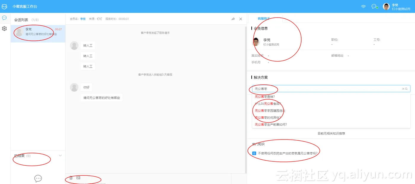在线客服正常的聊天界面如图:分为会话列表、已结束、对话框、输入框、会员信息框、搜索框、推荐知识等模块。客服可以直接在输入框输入相关回复内容。会话列表展示现在正在接待的客户信息。右上角为客户的详细信息。