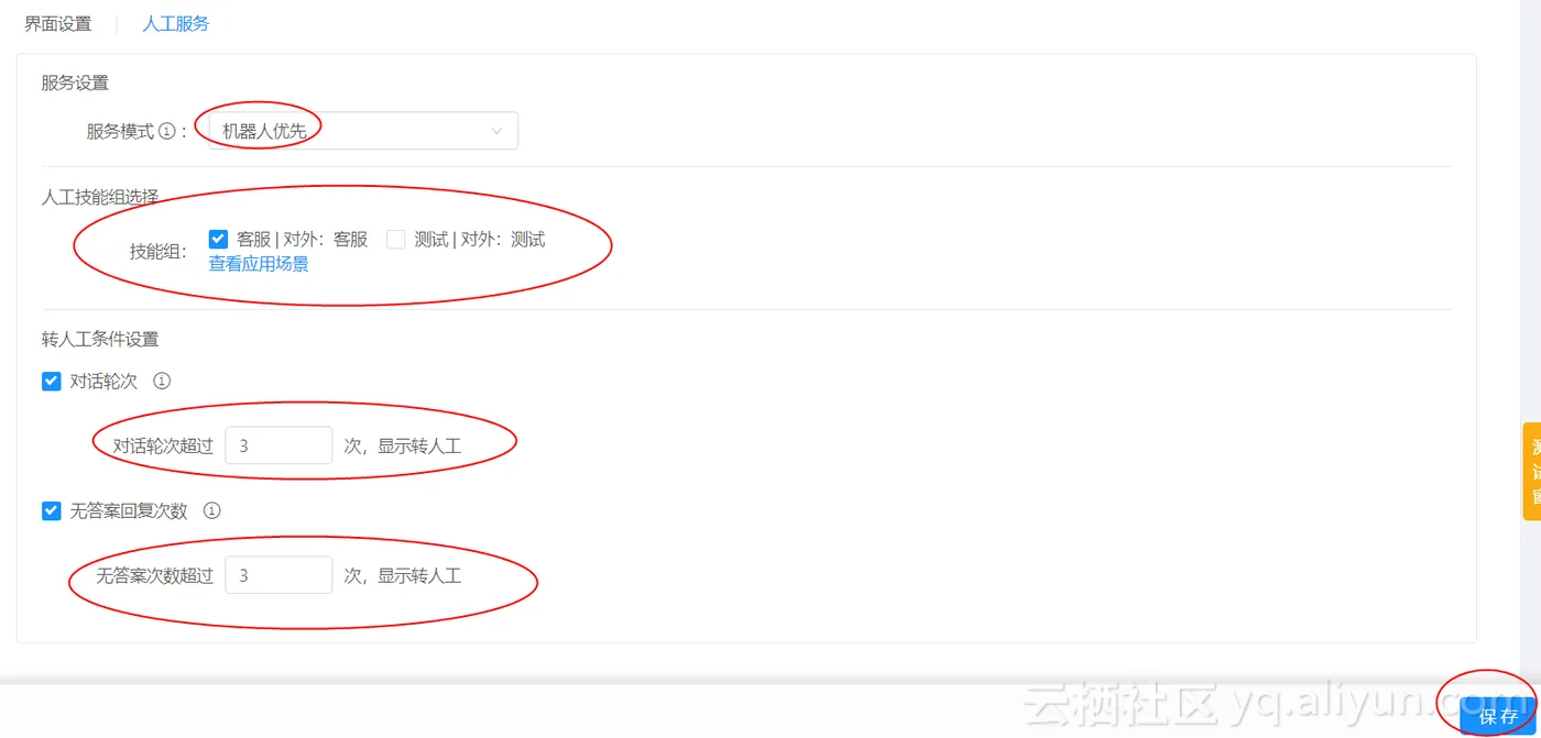 4.3机器人:设置无答案或者多轮对话转人工时,建议根据实际情况谨慎设置多少次之后转发。