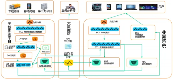 在上图中可以看到,来自车载终端、移动终端、第三方平台的数据通过负载均衡传送至基于阿里云的天枢系统平台。其中值得注意的是,经过ECS流式处理集群的数据,有一部分比较简单的规律性的数据通过KVStore来进行处理即可,而相对复杂且要求较高的数据则可以通过分布式关系型DRDS数据库,基本上实现了所有的数据处理需求,它承载了90%的关键性任务。