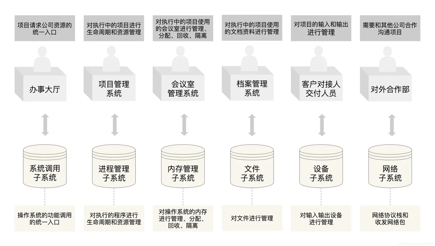 到这里,一个外包公司大部分的职能部门都凑齐了。你可以对应着下图的操作系统内核体系结构,回顾一下它们是如何组成一家公司的。