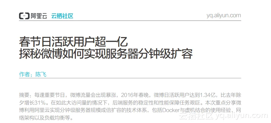 - 每逢重要节日,微博流量会出现暴涨,2016年春晚,微博日活跃用户达到1.34亿,比去年除夕增长31%。在如此大访问量的情况下,后端服务的稳定性和性能保障任务艰巨。微博研发中心技术经理及高级技术专家陈飞在《春节日活跃用户超一亿,探秘微博如何实现服务器分钟级扩容》中重点分享微博利用阿里云实现分钟级服务器规模成倍扩容的技术体系,包括Docker与虚机结合的使用经验、网络架构以及负载均衡等。