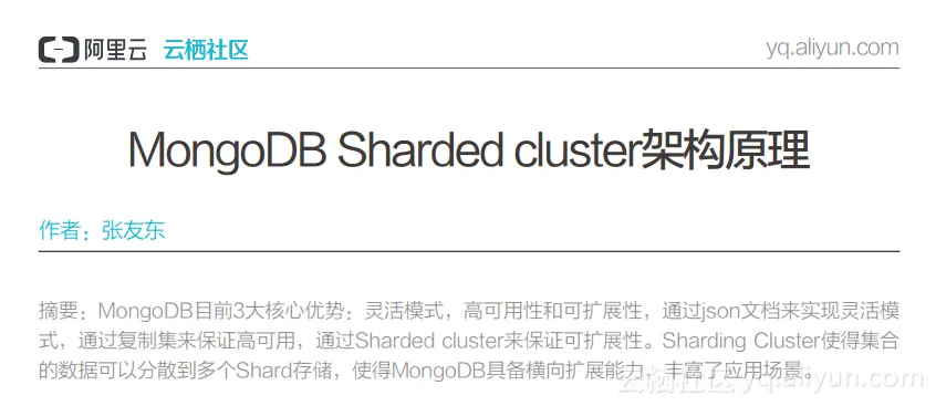 - MongoDB目前3大核心优势:灵活模式,高可用性和可扩展性,通过json文档来实现灵活模式,通过复制集来保证高可用,通过Sharded cluster来保证可扩展性。Sharding Cluster使得集合的数据可以分散到多个Shard存储,使得MongoDB具备横向扩展能力,丰富了应用场景。阿里云技术专家张友东为大家分享了《MongoDB Sharded cluster架构原理》,带大家深入浅出了解MongoDB。