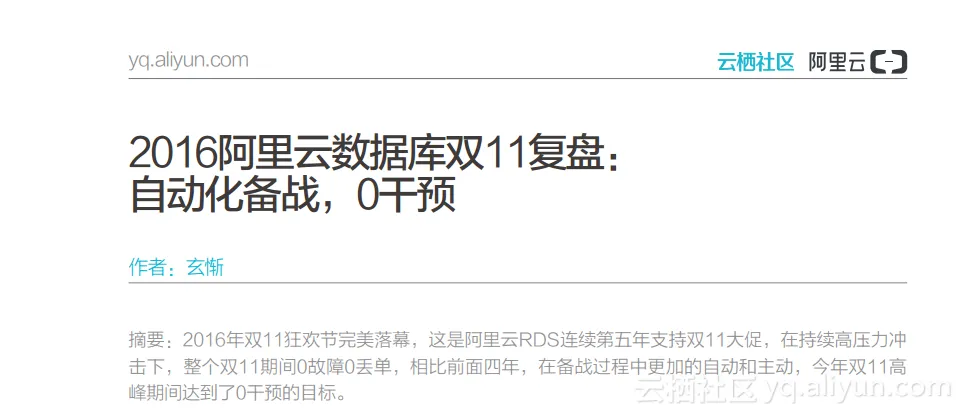 - 2016年双11狂欢节完美落幕,这是阿里云RDS连续第五年支持双11大促,在持续高压力冲击下,整个双11期间0故障0丢单,相比前面四年,在备战过程中更加的自动和主动,今年双11高峰期间达到了0干预的目标。阿里云技术专家玄惭在《2016阿里云数据库双11复盘:自动化备战,0干预》中为大家送上了阿里云数据库技术实战经验。
