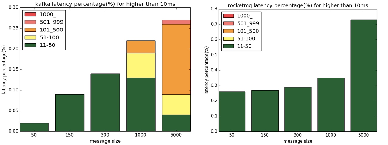 高性能的RocketMQ可应用于更多的场景,能接管和替代Kafka更多的生态,同时可以更大程度上承受热点问题,在保持高性能的同时,RocketMQ在低延迟方面依然具有领先地位,如下图所示,RocketMQ仅有少量10~50ms的毛刺延迟,Kafka则有不少500~1s的毛刺。
