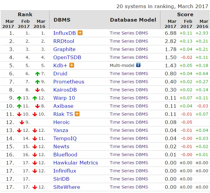 于是一开始的选型是用 时序数据库InfluxDB。这里贴一张截至当前的时序数据库排名(2017-03 popularity ranking of time Series DBMS )。