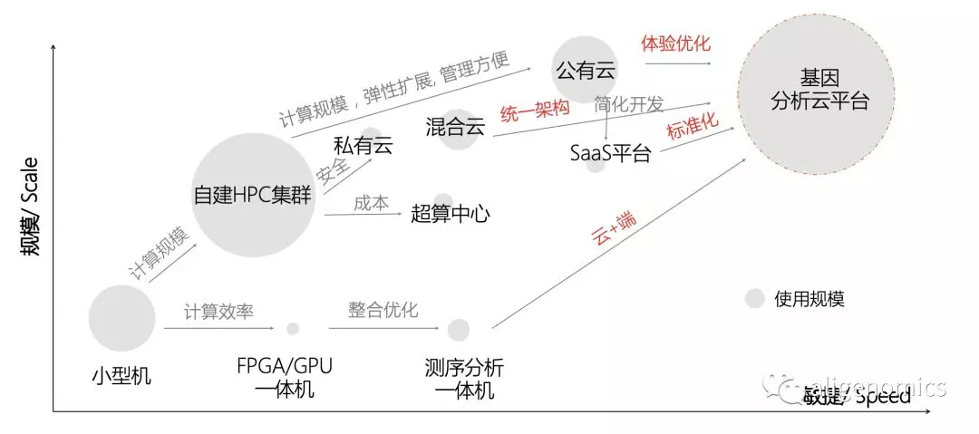 基因行业客户,从个人用户到政府的基因组学机构,规模差异很大。在过去几年时间内,出于成本、业务、管理、开发等等因素的考虑,可能使用的方案,从单台服务器,到大型高性能计算集群,SaaS平台都有,种类多样。但是随着业务规模增大和分析速度下降,云计算以其弹性扩展,按需付费的最大优势,成为所有方案演化的方向或必不可少的组成成分。对于初创型的公司,可以完全基于云环境的各种产品和服务,0成本、敏捷快速的构建自己云原生的业务系统。对于已有大型集群的客户,可以通过混合云的方案,来最大化利用本地资源,同时又利用云的弹性来消化业务高峰,避免再采购资源。