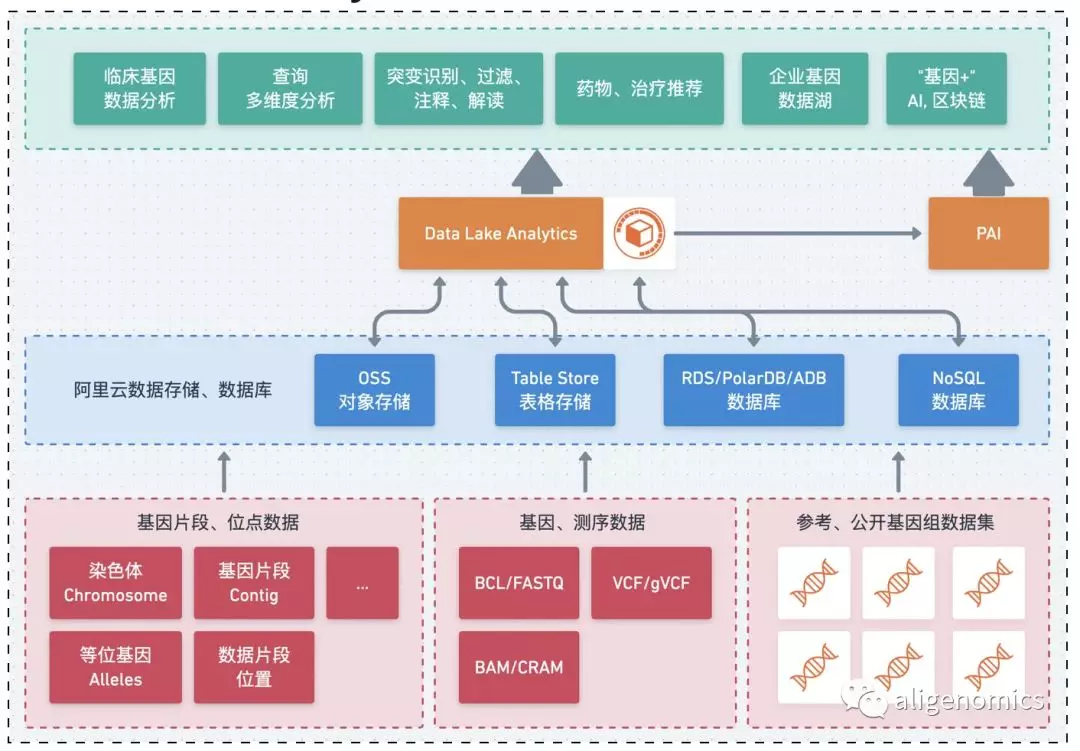 基因公司都应该是大数据公司。随着自身业务的开展,内部积累的样本数据也是越来越多。在达到千万级别的显著规模,如何利用样本数据去构建知识库,建立变异基线,开发和优化临床应用,是每个用户都需要考虑的重要问题。将基因数据,表型数据集中存储到阿里云上,构建统一的企业基因数据湖,使用阿里云DLA,EMR,PAI等丰富的分析产品生态来进行多来源,多种类,多维度的数据查询和高级分析工作。而不是自己使用初级的程序脚本读取文件解析,或者搭建维护一套难以满足真实生产需要的复杂系统。通过完整方法论和工具来进行数据治理和数据智能分析会是基因的核心竞争力之一。