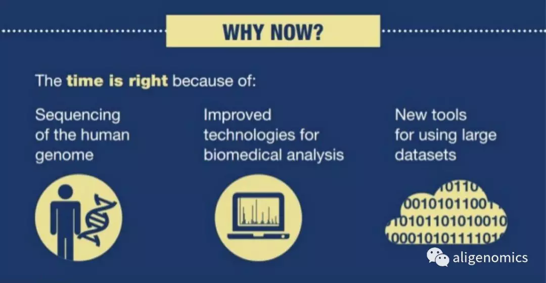 美国的精准医学计划的介绍材料中,对于项目的背景做一个解释说明。为什么是现在,我们可以开展百万人规模的大型基因组研究项目。其中提到了三个必要条件,也可以从侧面来回答我们哪些是需要去解决的问题: