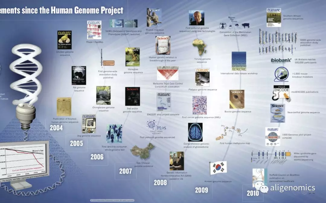 但是人类基因组测序还不能算是“完成”了,部分区域序列还无法进行测序。同时,单个的参考基因组也不能代表所有人群的遗传特点。在完成第一个人类基因组测序工作后,2007年,第一个黄种人的基因组;2008年,千人基因组计划也都相继启动和完成。科学家们从1到1000,继续在探索人类基因遗传的奥秘。2010年,英国科学家宣布UK10K项目,希望通过1万人的基因序列和个人健康信息结合,来更好理解低频的基因突变与人类疾病之间的关联关系。这也是之后各国大型人群的基因组学研究的一个通用思路,如何从百万级别的基因和表型数据中,去发现更多的疾病发生机理,诊断方法和治疗措施。