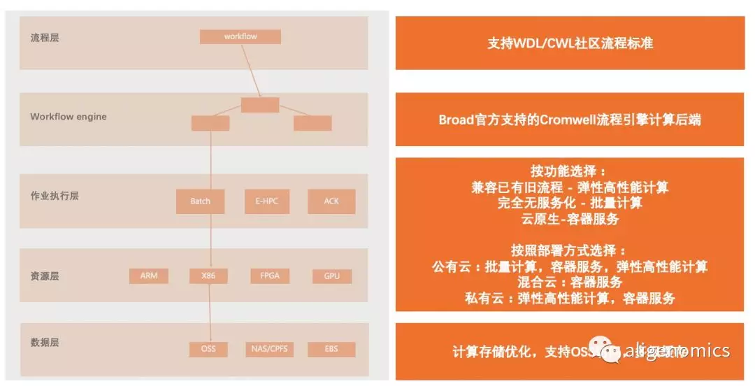 阿里云计算产品EHPC,ACK,批量计算,作为WDL流程的底层执行引擎,都能充分发挥云计算的优势。对于用户来说,完全按照使用量来付费,并且可以在不增加成本的基础上,快速扩展规模以加快分析速度,节省时间。结合包月,按量,竞价等多种灵活的付费方式,用户也能节省大量成本。同时,针对与用户不同功能需求和部署要求,三个计算产品也更有优势,方便用户选择。