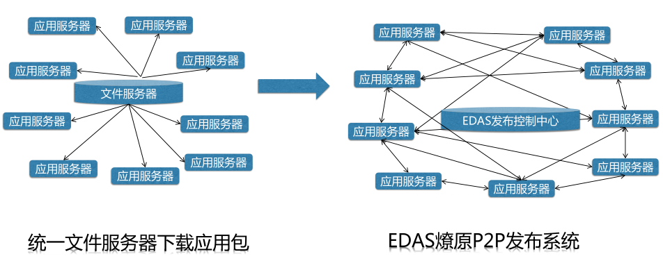 以前是集中化的发布方式进行管理的,这对于一、二百台机器是没有问题的。然而,现在需要同时发布五、六百台机器甚至更多,发布就会成为瓶颈。对此,我们内部引入EDAS燎原P2P发布系统,它能够让系统内进行P2P多点式的多host发布,使整个系统的应用发布能力得到快速提升。