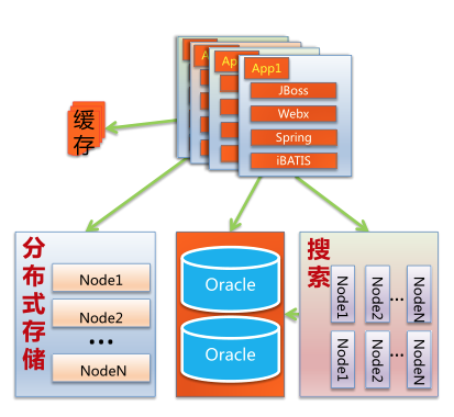 阿里前期技术团队规模500人左右,单一War应用,是以PHP为核心构建的系统,PHP+MySQL+Linux+Apache标准的LAMP的系统架构,后来逐渐用一些开源的技术替换掉了原来的商业产品,随着业务的不断发展,不断的把新的代码加入到系统中,我们研发了一套分布式存储架构,搜索也是自己构建的。