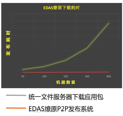 EDAS燎原实现超大规模集群闪电发布,图中可以看出发布耗时随着机器数量增加变化趋势。采用EDAS燎原发布系统,随着应用实例的增加,发布的时间几乎保持不变。有利于进行紧急发布时候的业务处理,实现快速回滚。