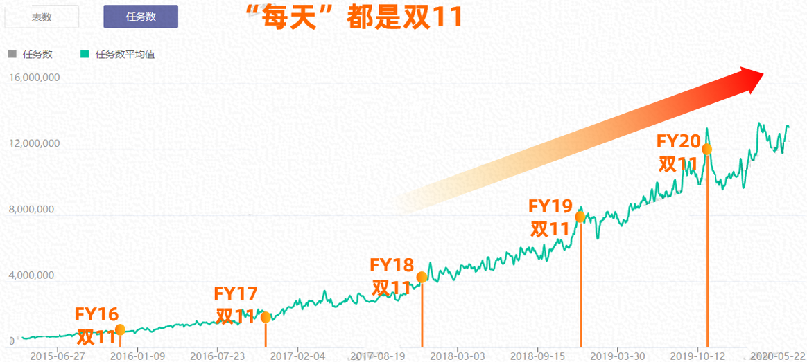 作为阿里巴巴集团技术的练兵场,双11对于阿里核心计算平台的分布式执行调度框架而言,无疑是面对海量大规模作业时,稳定性与可扩展性方面的最好检验。今天平台上每天调度执行着超过千万的分布式作业,2020双11期间(11月1号到11月11号),作业总数超过了1.5亿,单日作业数峰值超过1600万,单日处理数据量超过1.7EB。而另一方面,如同鲁肃所言,"双 11 的「变态」, 最终会变成未来的「常态」":以计算平台每日调度执行的分布式作业数为例,每年双11的作业数,相比去年同期,都以50%以上的速度在增长,而每年双11的峰值,终究会成为来年的日常状态。