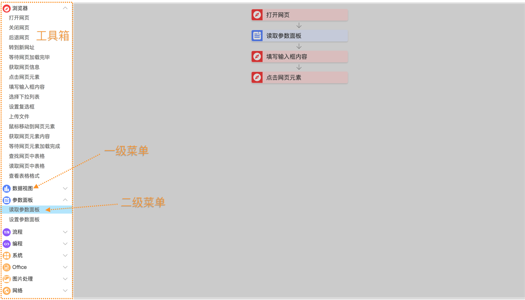 可视化编程界面主要分为“工具箱”、“画布区”两个部分,下面将逐一介绍其功能。