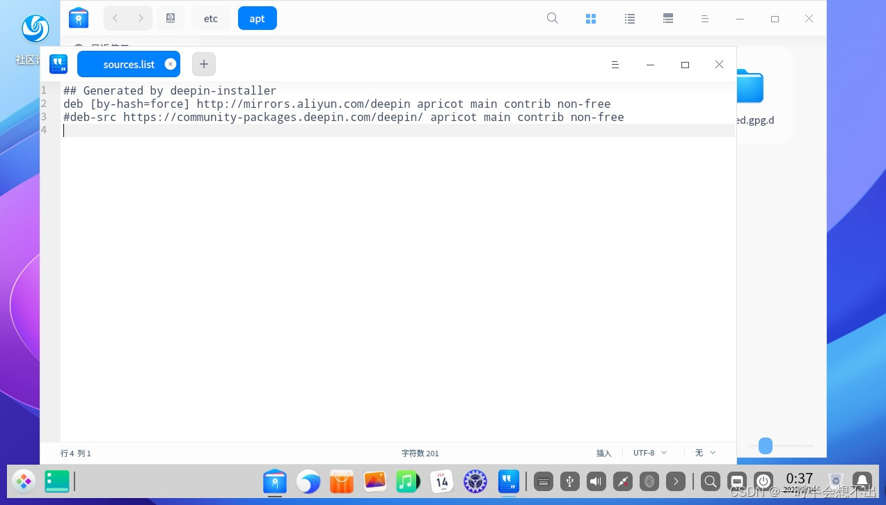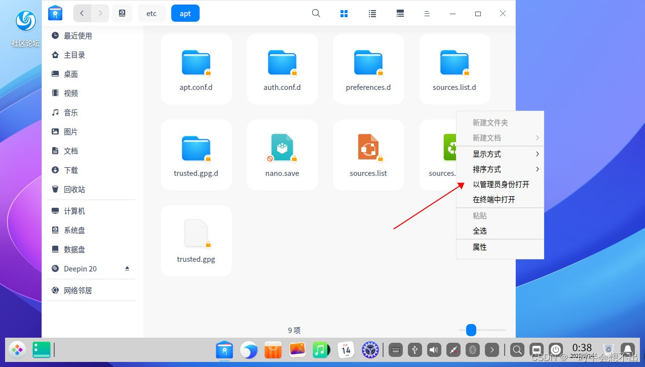 打开文件管理器进入到etc/apt目录下右键,以管理员模式打开