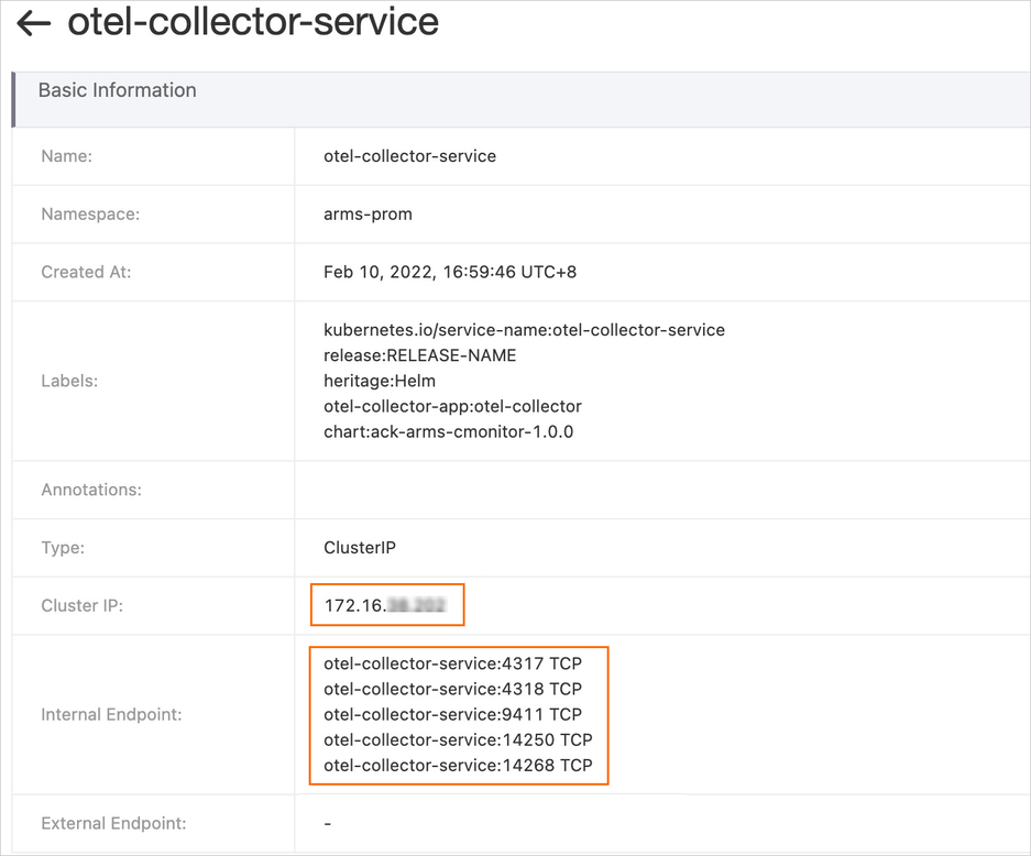 - 单击 otel-collector-service。查看 otel-collector-service(Service)是否正常运行,如下图所示对外暴露了多种 Receivers 端口接收 OpenTelemetry 数据,则表示安装成功。