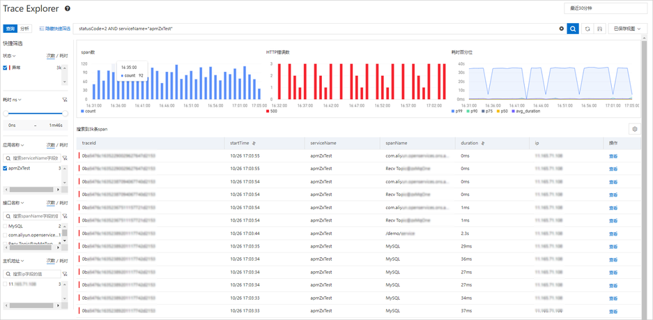 - Trace Explorer 后聚合分析针对 OpenTelemetry Trace 数据,ARMS 提供了灵活的多维筛选与后聚合分析能力,例如查询特定应用的异常链路。还可以根据 IP、接口等维度对 Trace 数据进行聚合。