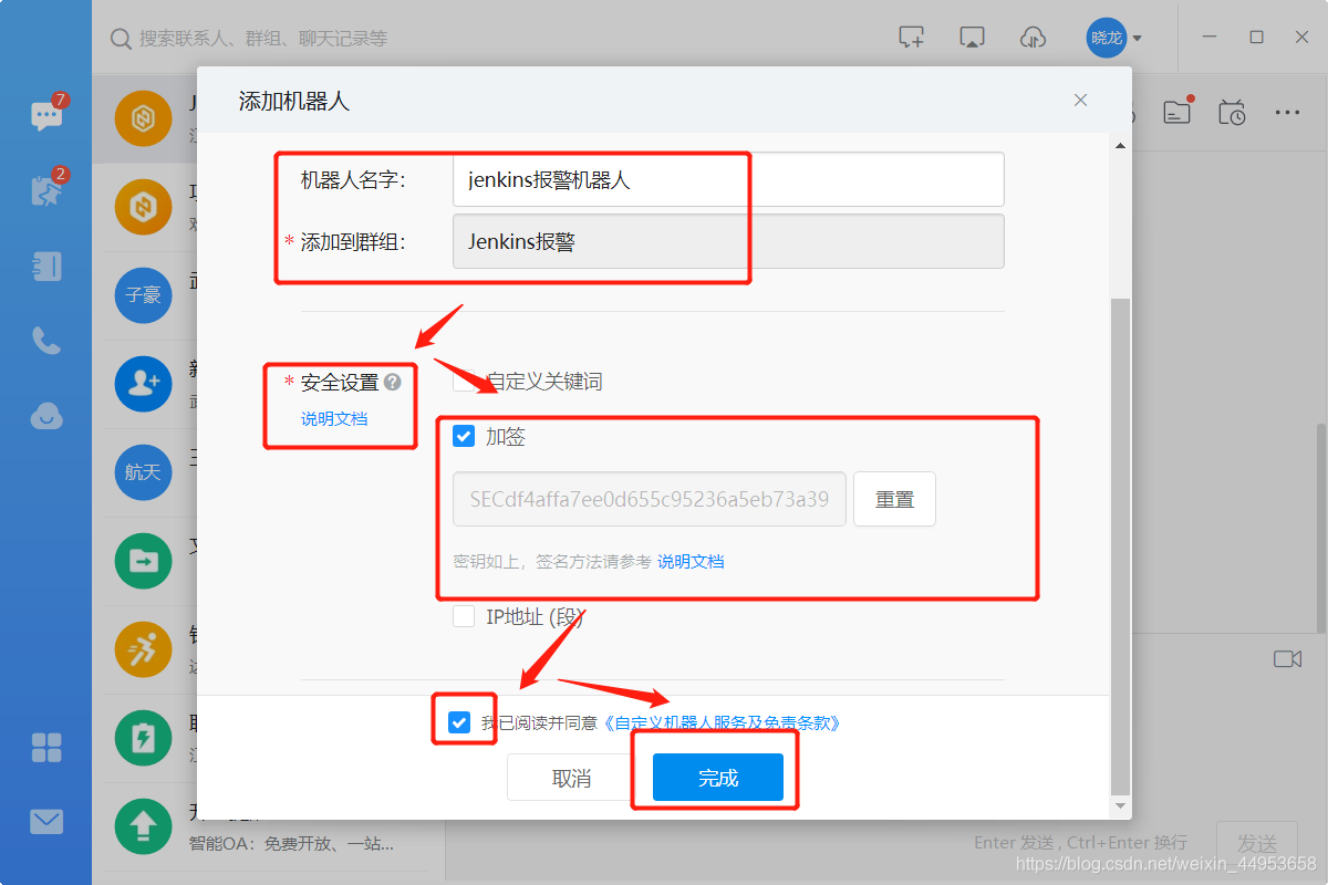 填写机器人姓名—设置安全设置为加密类型,并复制出来加密值