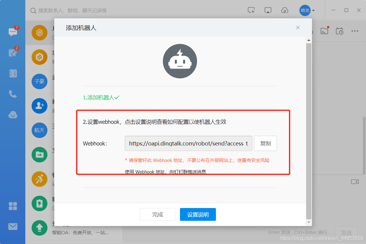 webhook是钉钉机器人创建完成后生成的