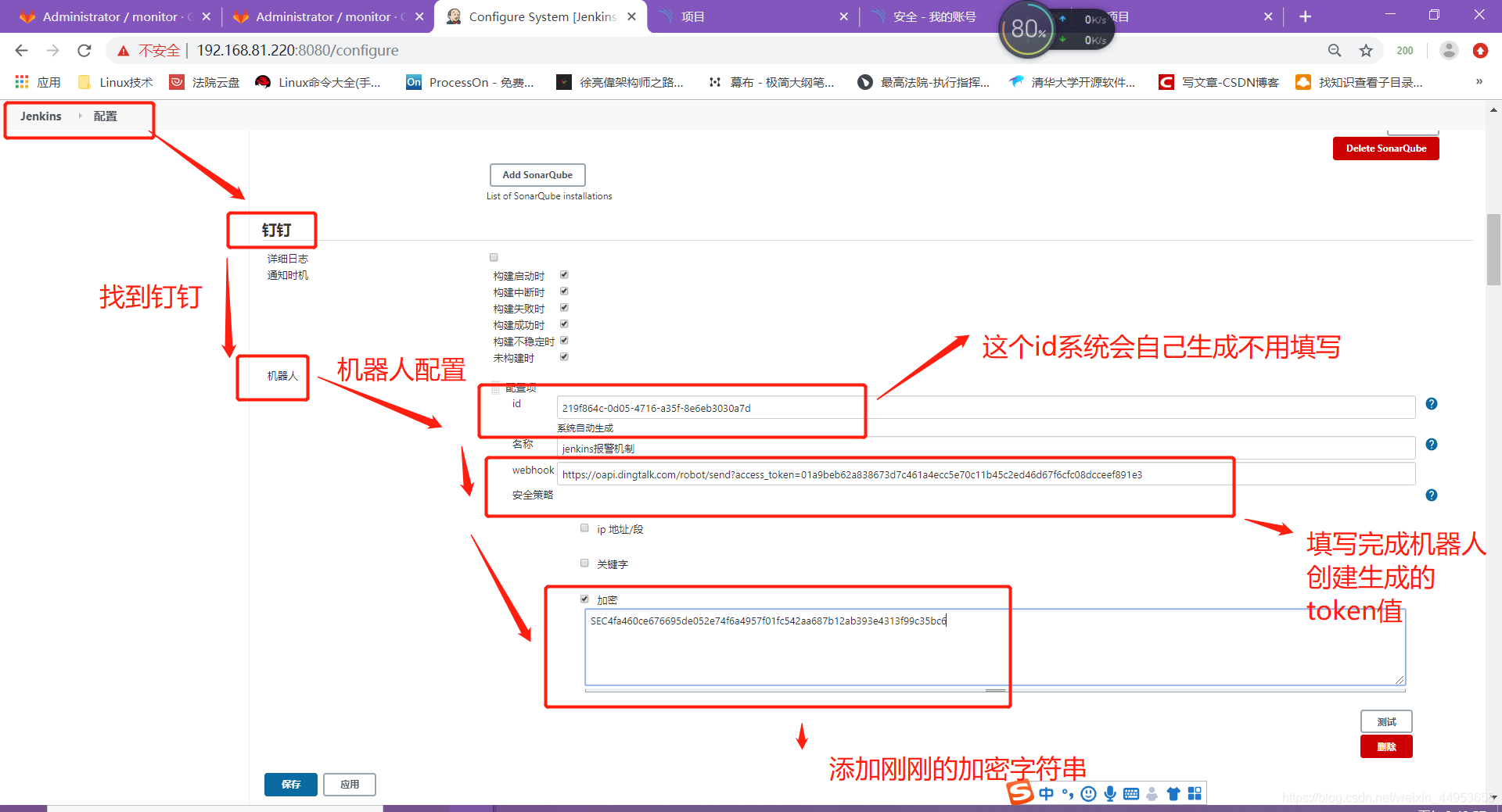 3.在系统配置中填写钉钉机器人信息