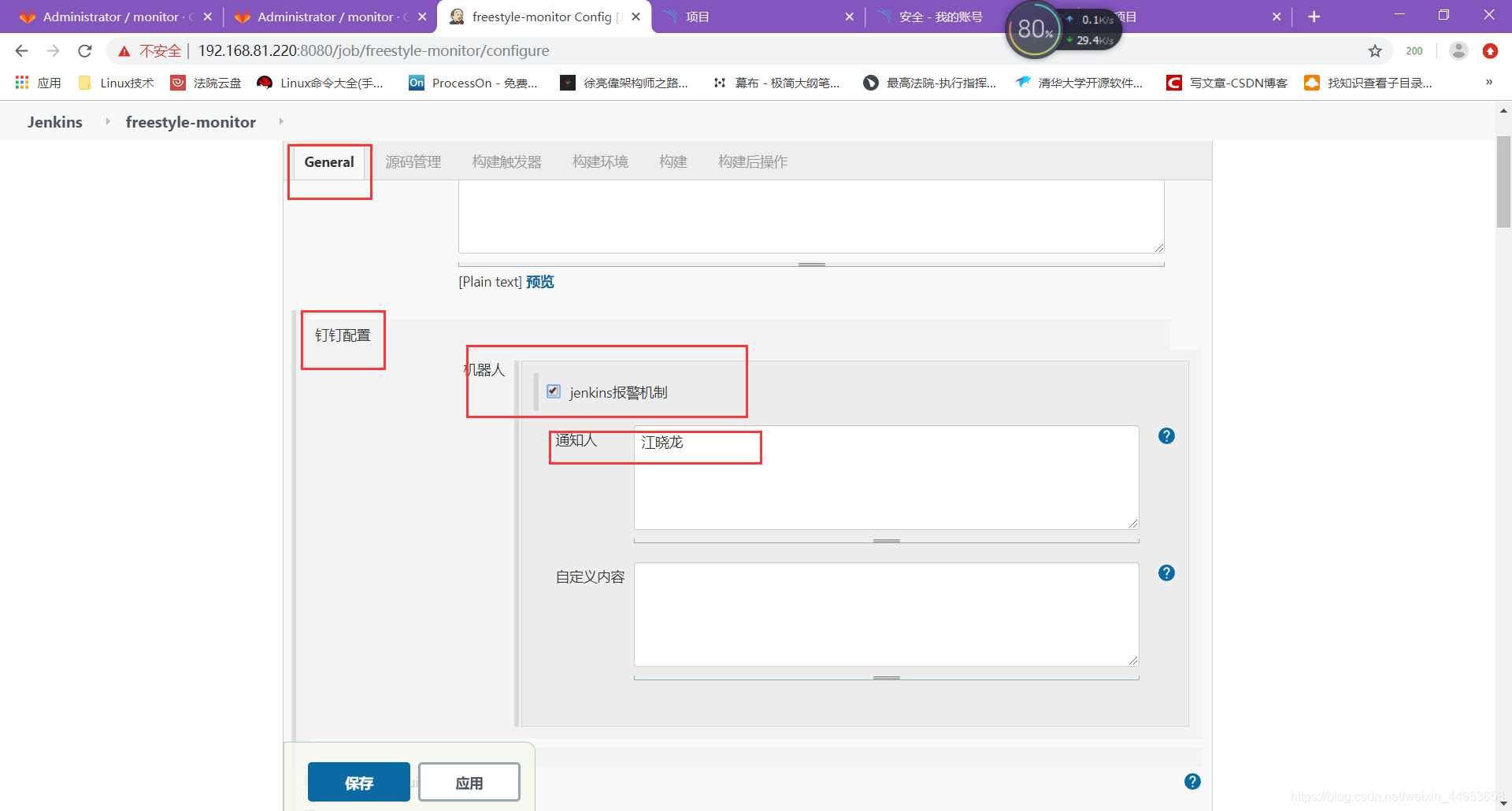 点击项目配置----general—钉钉配置—勾选jenkins报警机制(刚刚在系统添加机器人信息时定义的名称)—填写通知人