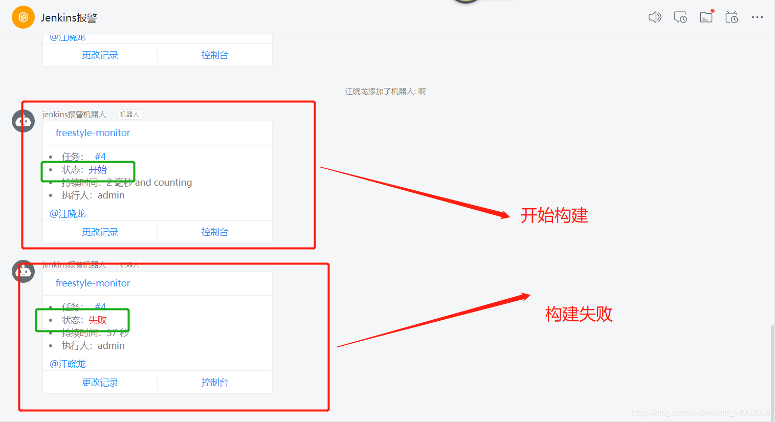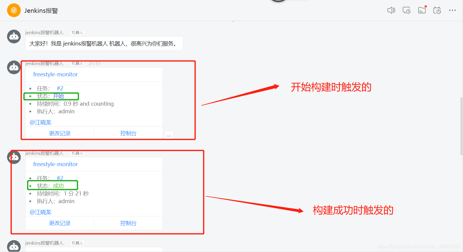 消息里面会有项目名称,是第几个构建任务,构建的状态、执行人、时间