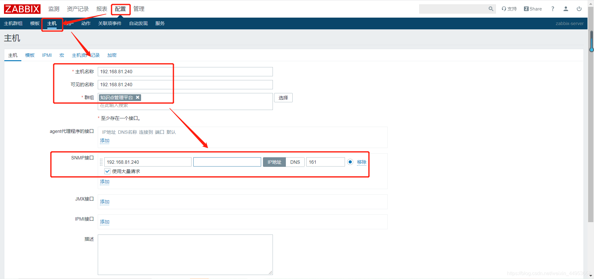 配置—主机—创建主机—填写主机名称—移除agent程序–添加snmp接口—填写被控端地址