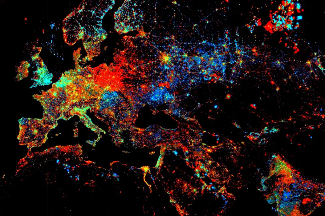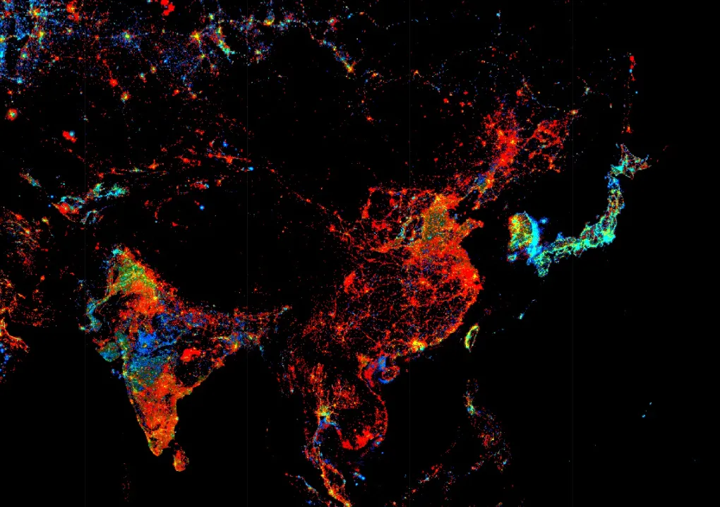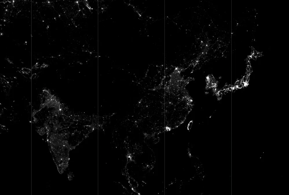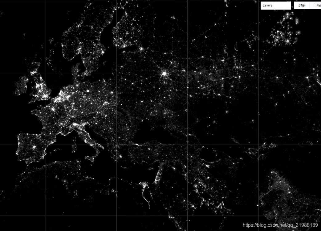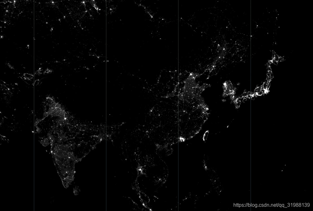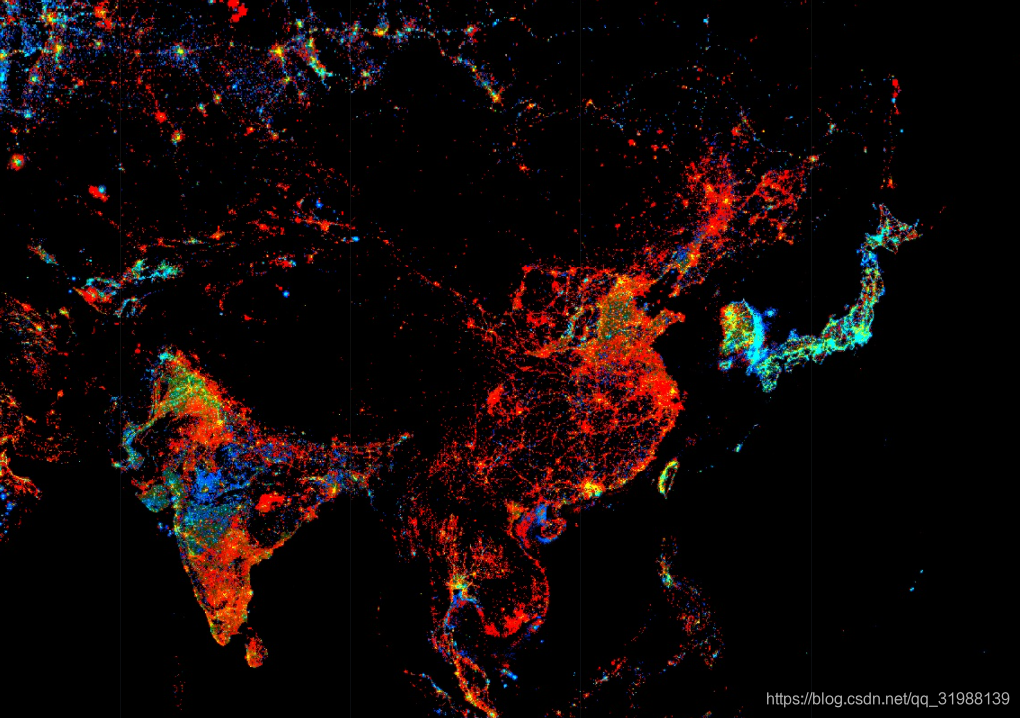 //先进行时间函数的确立,并添加波段,方便一会进行map遍历分析 function createTimeBand(img) { var year = img.date().difference(ee.Date('1990-01-01'), 'year'); return ee.Image(year).float().addBands(img); } // Fit a linear trend to the nighttime lights collection. var collection = ee.ImageCollection('NOAA/DMSP-OLS/CALIBRATED_LIGHTS_V4') .select('avg_vis') .map(createTimeBand); //通过ee.Reducer.linearFit()来计算其变化趋势 var fit = collection.reduce(ee.Reducer.linearFit()); //选择第一张影像进行分析和展示 // Display a single image Map.addLayer(ee.Image(collection.select('avg_vis').first()), {min: 0, max: 63}, 'stable lights first asset'); // Display trend in red/blue, brightness in green. //展示变化趋势,分别用'scale', 'offset', 'scale'三个波段来进行颜色区分 Map.setCenter(30, 45, 4); Map.addLayer(fit, {min: 0, max: [0.18, 20, -0.18], bands: ['scale', 'offset', 'scale']}, 'stable lights trend');