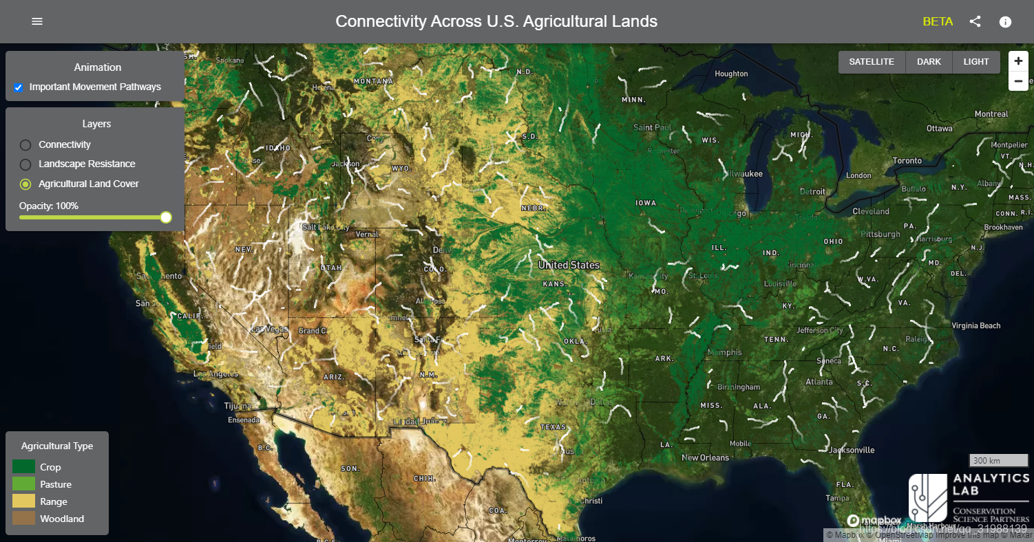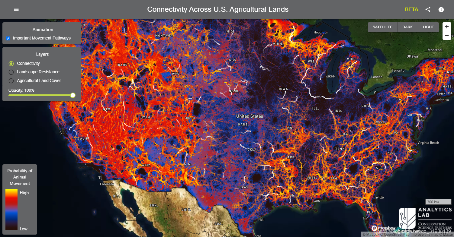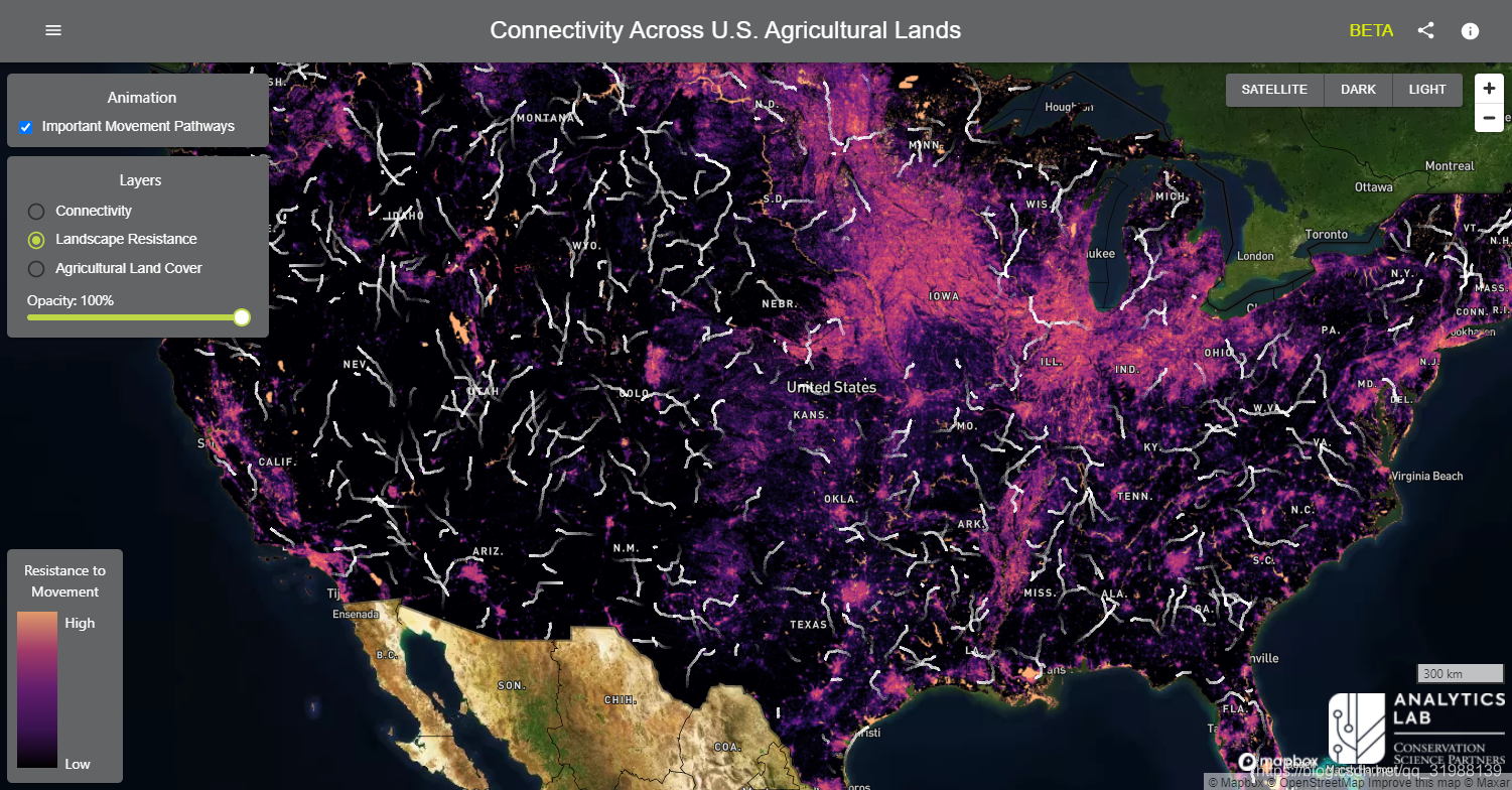 第一个:美国农业用地的野生动物连通性监测平台,主要是为了促进野生动物运动轨迹的监测探索工作景观在促进野生动物运动方面的作用。
