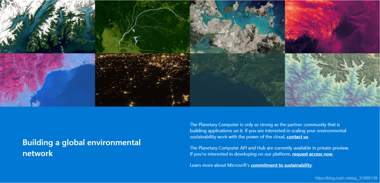 微软作为世界上最牛叉的操作系统,现在开始对云平台下手了,而且作为史诗级的云平台监测,将来可以会和Google earth engine(GEE)相匹敌,而且在不远的将来,云计算和AI智慧的运用,将会对我们全球变化的监测的预警起到十分重要的影像,现在我们来看一下: