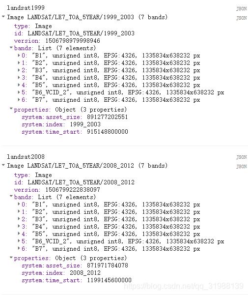 仅考虑两个输入之间未屏蔽像素的交集并将其返回为未屏蔽,其他所有像素均已屏蔽。通常,如果任一输入只有一个波段,则它会用于另一个输入中的所有波段。如果输入具有相同数量的波段,但名称不同,则它们按自然顺序成对使用。输出波段以两个输入中较长的命名,或者如果它们的长度相等,则按第一个输入的顺序命名。输出像素的类型是输入类型的并集。下面这张图就是波段信息:在此示例的第二部分中,使用 计算平方差 image.pow(2)。有关处理基本算术、三角、幂、舍入、强制转换、按位运算等.