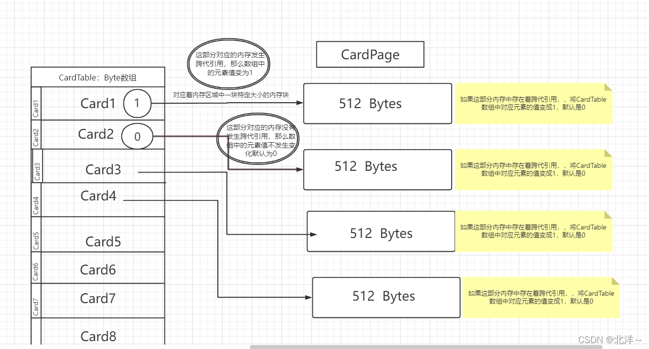 我数组中的每一小块对应的元素是分代中固定大小的内存(比如我第一个数组下标表示我引用的是0到100,第二个数组下标表示引用的是100-200以此类推)。当我第一个数组下标对应内存跨域引用了其他分代中的内存,我将把第一个数组下标对应的内存的元素值标识为1代表脏(Dirty),没有则为0。当垃圾回收时,我就知道哪部分内存是跨代引用并将他们加入到GC Roots进行扫描(将数组中元素为1对应的内存对象加入GC Roots中)。