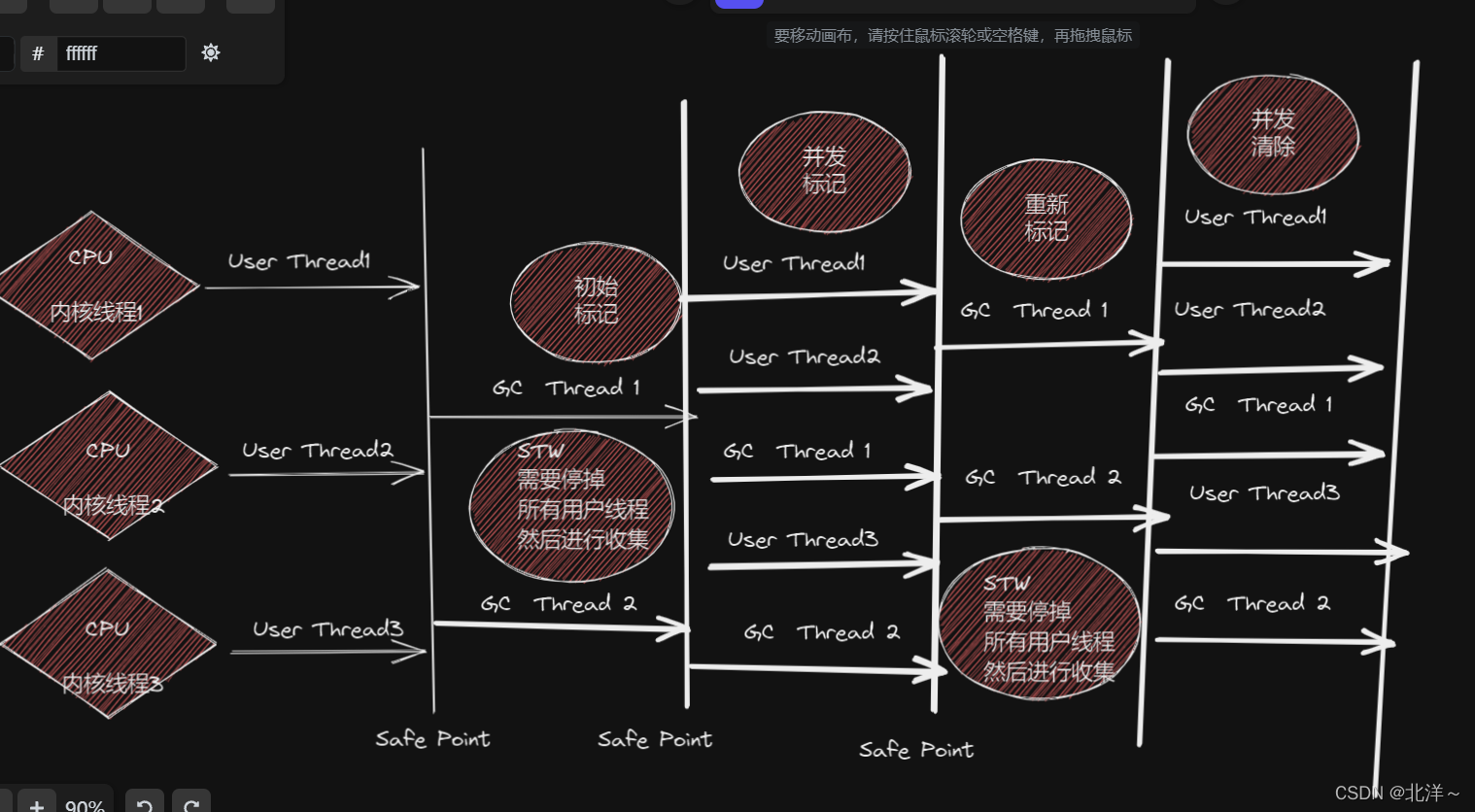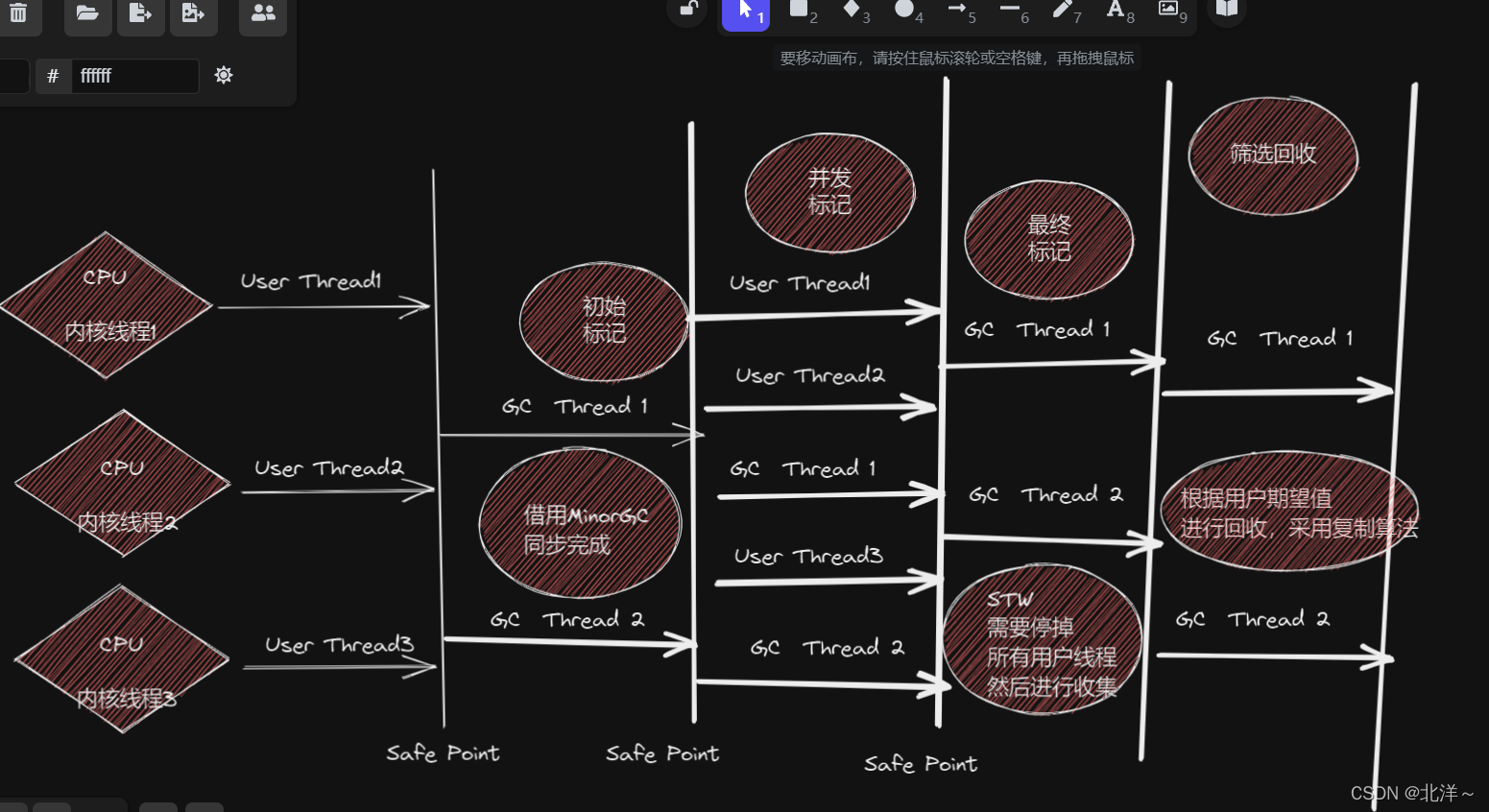 并发:同一时间GC和用户线程可以一起工作一起运行。因此程序依然能够响应用户线程的操作但是由于GC线程也占用了一部分系统资源,所以此时的用户线程处理的效率会下降
