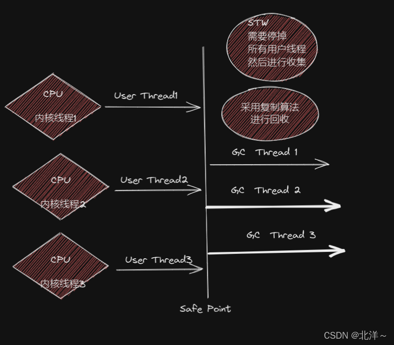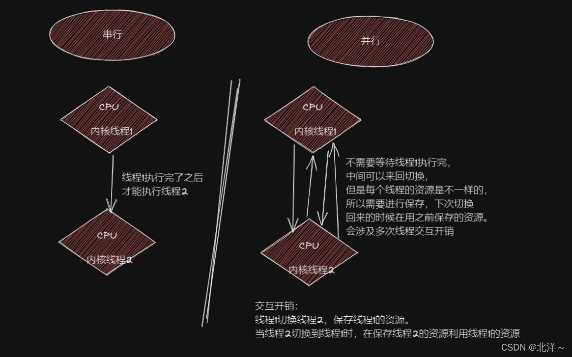 第一点也就是线程串行执行一个线程完了之后才能执行下一个线程,而对于并行的来说其实本质上还是串行只不过各个线程间可以自由来回切换,所以需要对切换前后的资源进行额外的保存等等因此并发涉及到的这部分线程交互开销对于该款串行执行的GC线程时没有的