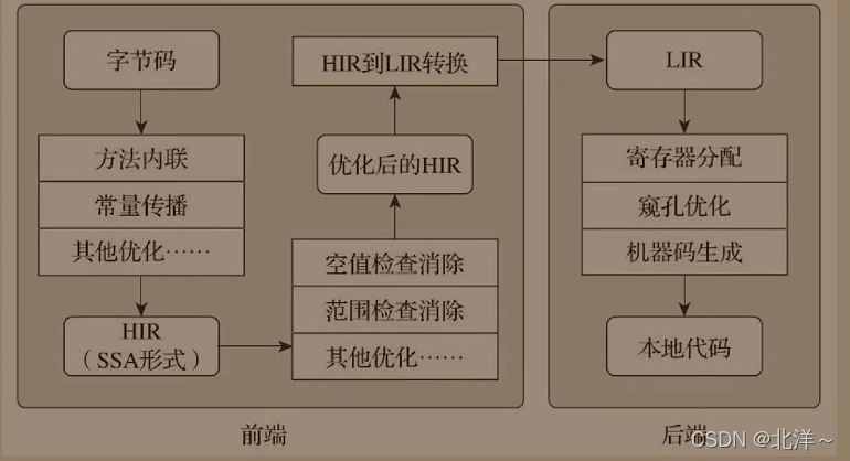 一,和刚开始的编译流程一样,收到字节码之后也会进行一系列分析然后进行优化接着构造出语法分析树(高级中间代码表示形式与源代码相关的中间表示HIR)。
