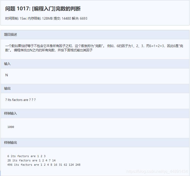 #include <stdio.h> int main() { int N; scanf("%d", &N); int yinzi[N]; //用来存放所查询的数的因子,打印需要 int sum = 0; //因子总和 int n = 0; //含有因子的个数 int i, j, k; for (i = 2; i < N; i++) //遍历N之内的所有数,从2~N { for (j = 1; j <= i/2; j++) //用该数除以该数内所有数,若余数为0,则为其因子,不考虑它本身 //加快速度1 一个数的因子不可能超过它的1/2 { if (i % j == 0) { yinzi[n++] = j; sum += j; //对因子求和 if (sum > i) //加快速度2 当求得sum已经大于该数的时候,提前break { sum = 0; n = 0; break; } } } if (sum == i) { printf("%d its factors are ", i); for (k = 0; k < n; k++) printf("%d ", yinzi[k]); printf("\n"); } sum = 0; //注意清0 n = 0; } return 0; }