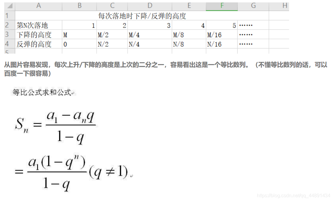 - 第N次下落时反弹所得的高度很容易得到,每次反弹是上一次的1/2,第N次就是第一次的(1/2)^N.