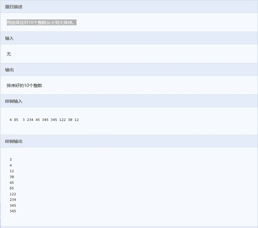 #include<stdio.h> int main() { int a[10],i,j,temp; for(i=0; i<10; i++){ scanf("%d",&a[i]); } for(i=0; i<9; i++){ for(j=i+1;j<10;j++) { if(a[i]>=a[j]) { temp=a[i]; a[i]=a[j]; a[j]=temp; } } } for(i=0; i<10; i++){ printf("%d\n",a[i]); } return 0; }