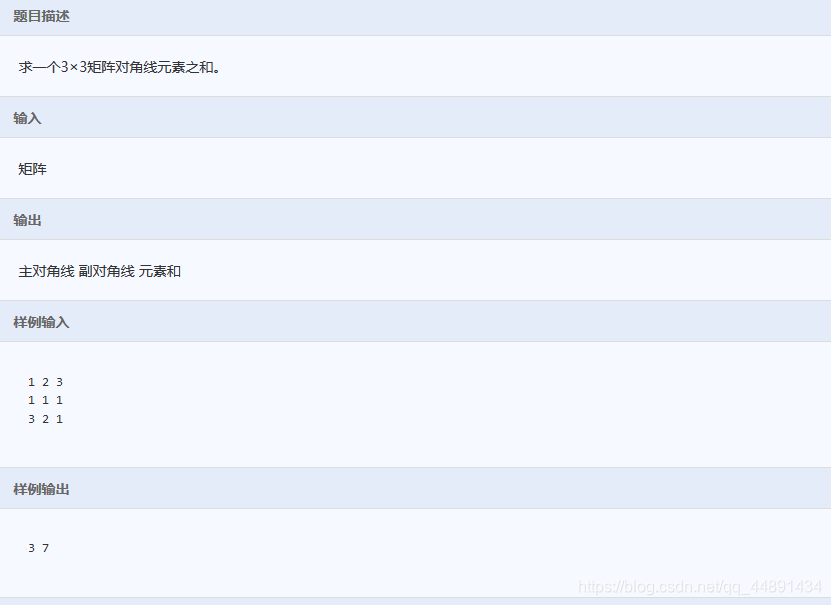 #include<stdio.h> int main(){ int i,j,s1 = 0,s2 = 0; int a[3][3]; for(i = 0;i < 3;i++){ for( j = 0;j < 3;j++){ scanf("%d",&a[i][j]); } } for(i = 0;i < 3;i++){ for( j = 0;j < 3;j++){ if( i == j) s1 += a[j][j]; if( i + j == 2) s2 += a[i][j]; } } printf("%d %d\n",s1,s2); return 0; }